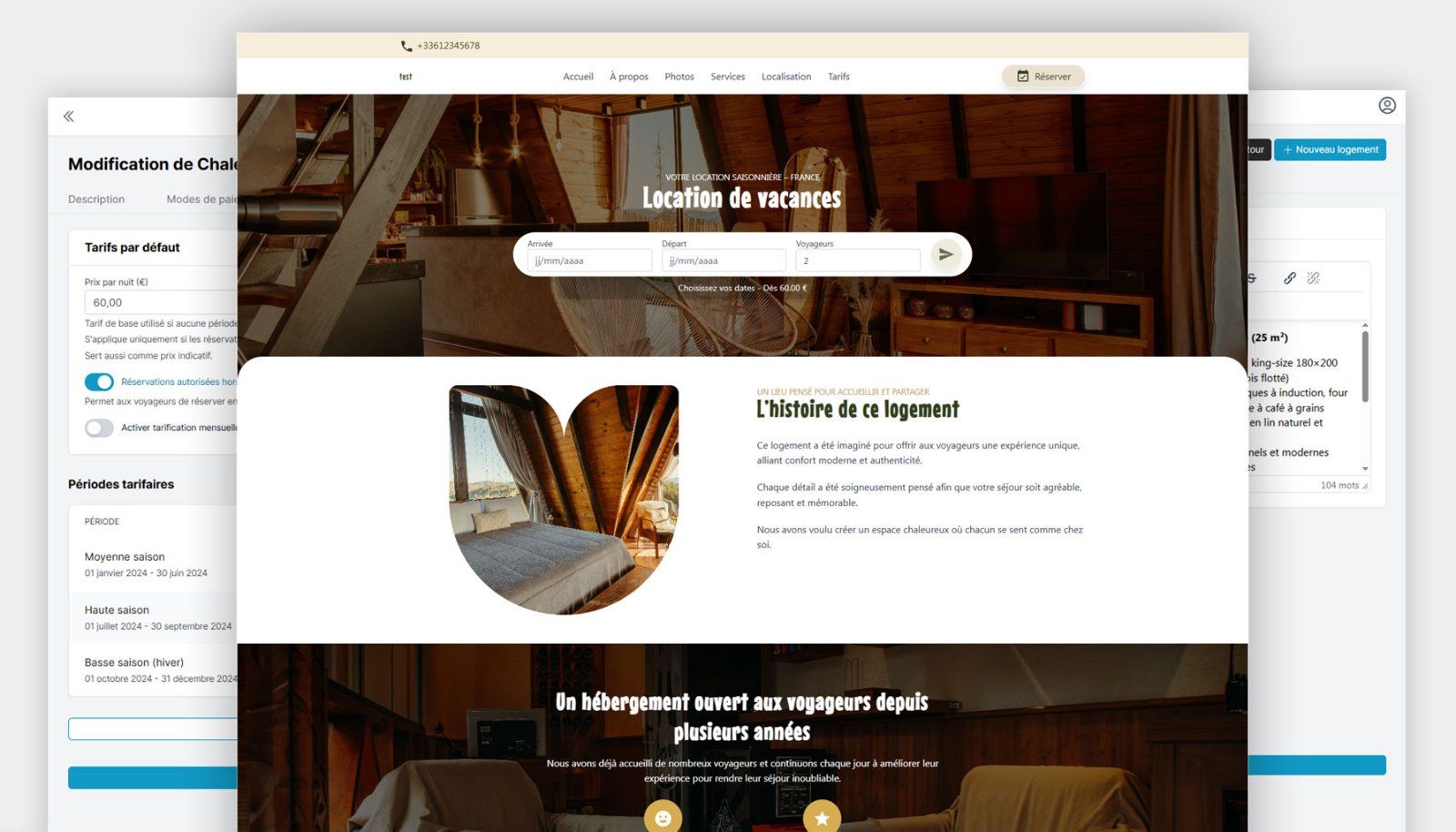 L’objectif est clair : un outil pro, net, qui va à l’essentiel. Vous gardez la main sur vos contenus, vos tarifs, votre SEO. Et surtout, vous captez les réservations en direct, sans intermédiaire inutile.